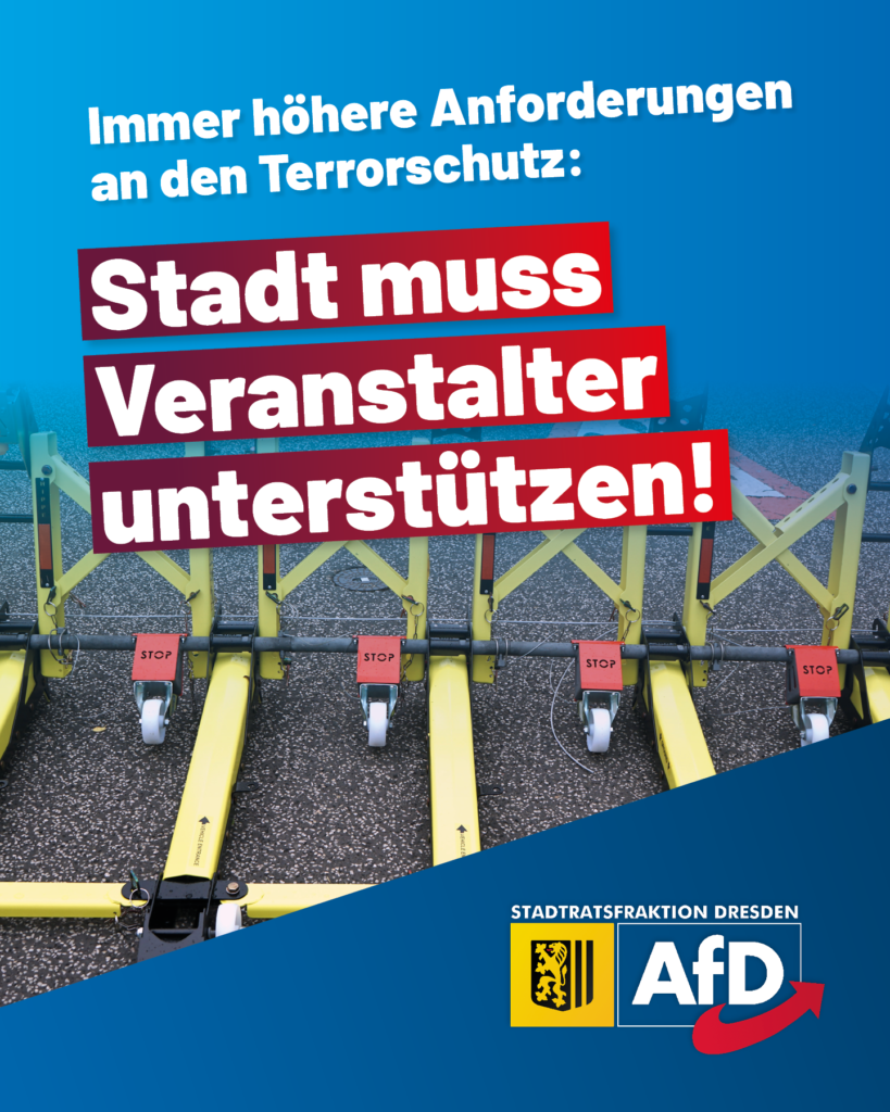 Angesichts einer weiterhin als „abstrakt hoch“ eingestuften Gefährdungslage bei Veranstaltungen verschärft die Landeshauptstadt Dresden ihre Sicherheitsanforderungen. Künftig sollen zusätzliche Maßnahmen zum Terrorschutz in vielen Fällen verpflichtend sein. Die entstehenden Kosten