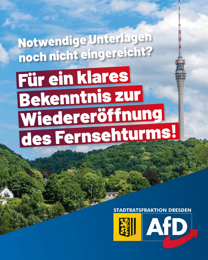 Daniela Walter, AfD-Stadträtin und Mitglied der Lenkungsgruppe Fernsehturm bewertet das wie folgt: „Die langersehnte Wiedereröffnung des Fernsehturms darf nicht an versäumten Fristen scheitern. Es braucht von der gesamten Stadtpolitik ein klares Bekenntnis zu diesem Projekt. Darüber hinaus muss sich Oberbürgermeister Hilbert persönlich dafür einsetzen, dass die Deutsche Funkturm GmbH alle Unterlagen rechtzeitig einreicht.“